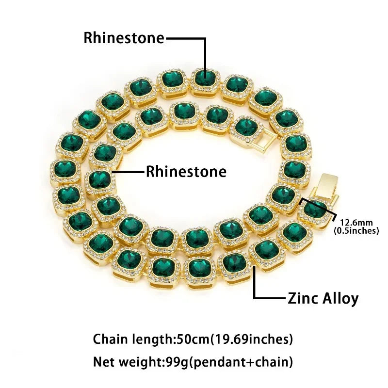 12mm Green sugar Hip Hop Shiny Cuban Link Chain Necklace Women Men Silver Color Rhinestone Iced Out Cuban Chain Punk Jewelry