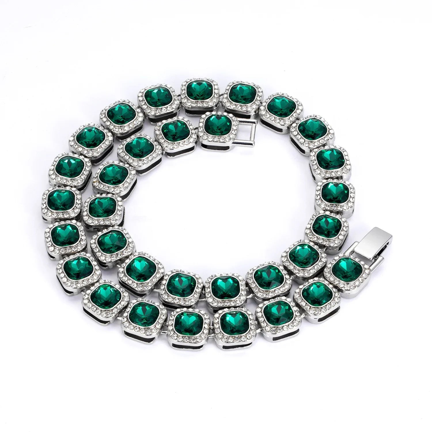 minus 12mm Green sugar Hip Hop Shiny Cuban Link Chain Necklace Women Men Silver Color Rhinestone Iced Out Cuban Chain Punk Jewelry